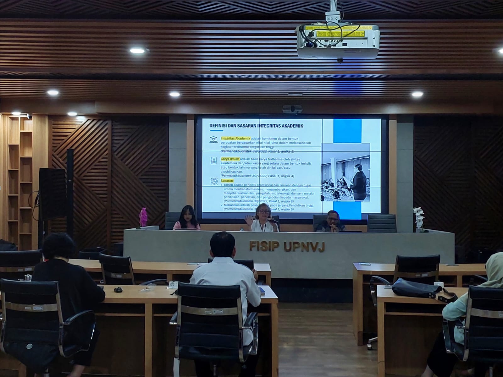 Sosialisasi di FISIP diarahkan langsung oleh Dr. Sri Lestari Wahyuningroem, beliau merupakan Ketua Tim Sosialisasi Integritas Akademik yang juga merupakan dosen di FISIP UPNVJ. Dalam pemaparannya, beliau menekankan pentingnya integritas sebagai landasan utama dalam menjaga kualitas pendidikan tinggi. Materi yang dibawakan mencakup berbagai bentuk pelanggaran akademik, aturan kepenulisan karya ilmiah, hingga prosedur pelaporan apabila ditemukan dugaan pelanggaran.