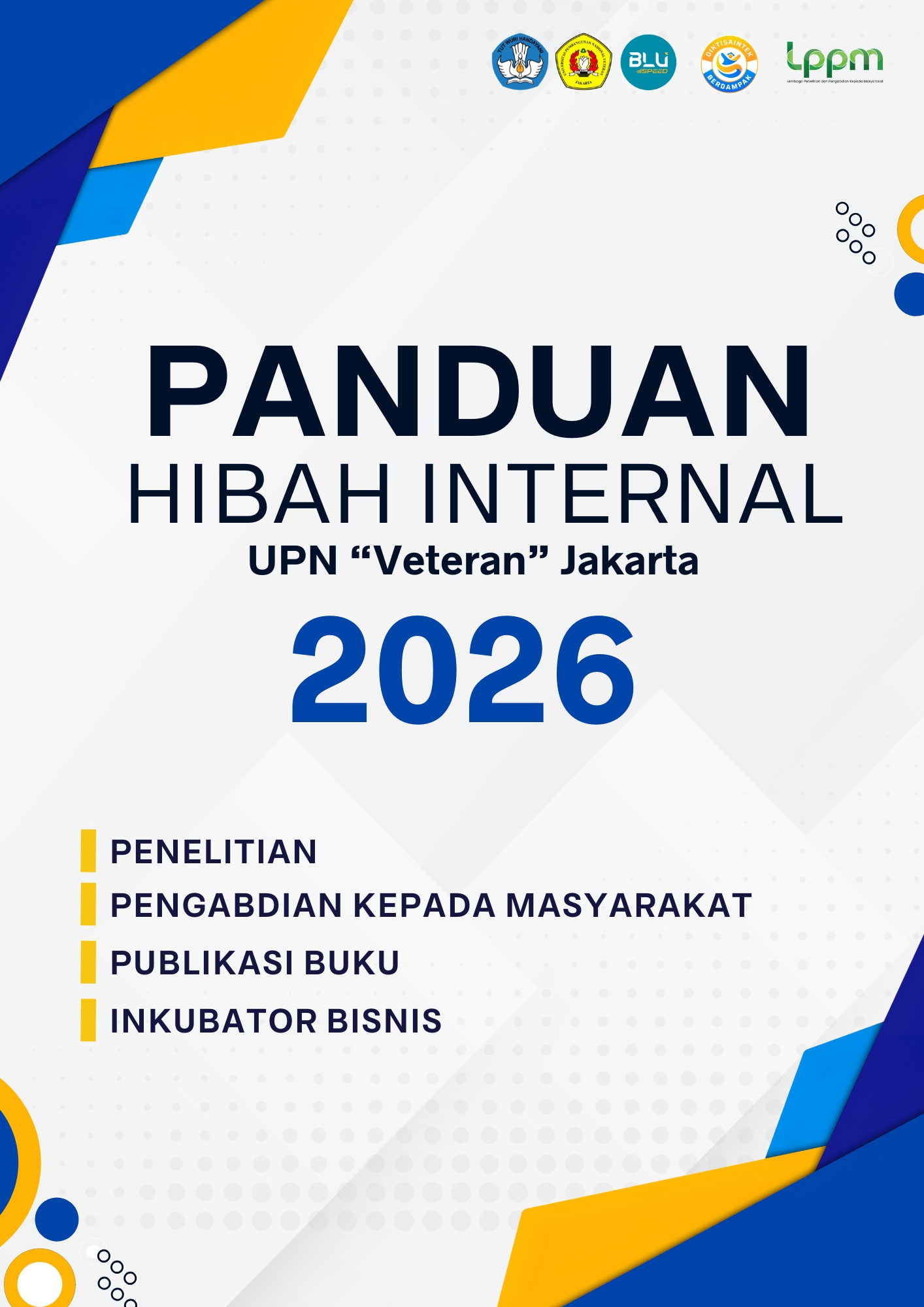 Lembaga Penelitian dan Pengabdian kepada Masyarakat (LPPM) Universitas Pembangunan Nasional “Veteran” Jakarta dengan bangga meluncurkan Panduan Resmi Hibah Internal UPN “Veteran” Jakarta Tahun 2026. Panduan ini disusun sebagai acuan pelaksanaan program hibah internal guna meningkatkan kualitas dan kuantitas penelitian, pengabdian kepada masyarakat, inkubator bisnis serta publikasi buku di lingkungan UPN “Veteran” Jakarta.