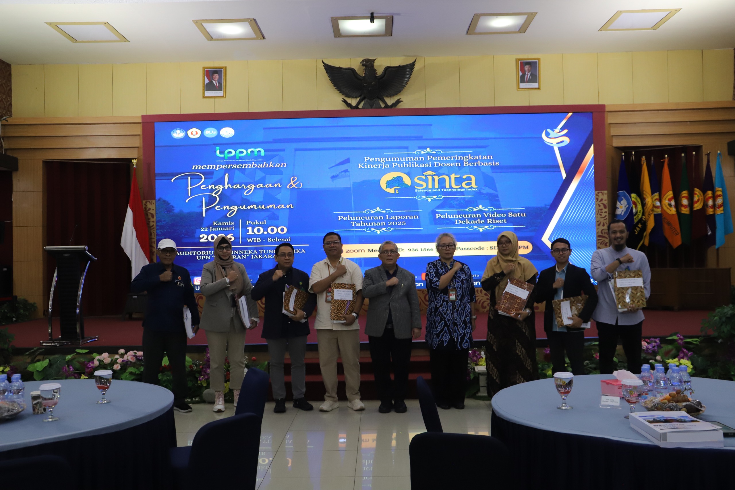 LPPM UPN “Veteran” Jakarta (22/1/26) – Lembaga Penelitian dan Pengabdian kepada Masyarakat (LPPM) Universitas Pembangunan Nasional “Veteran” Jakarta (UPNVJ) menyelenggarakan Pengumuman dan Penghargaan Pemeringkatan Kinerja Publikasi Dosen Berbasis SINTA Tahun 2025. Kegiatan ini berlangsung secara hybrid di Auditorium Bhinneka Tunggal Ika UPNVJ, pada Kamis 22 Januari 2026, dengan dihadiri pimpinan universitas, pimpinan fakultas, dosen, serta sivitas akademika UPNVJ.