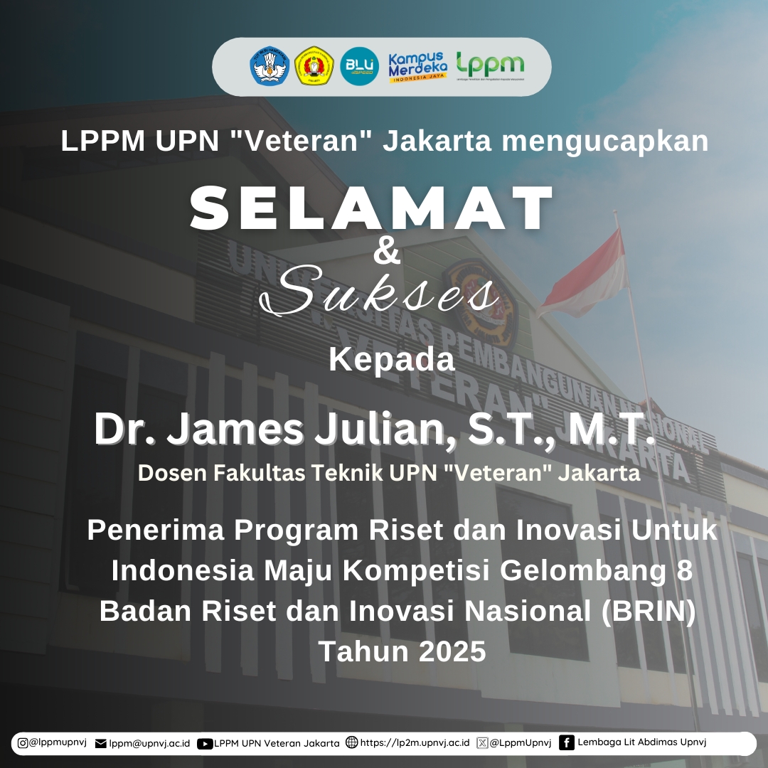 LPPM UPN “Veteran” Jakarta ( 10/09/2025) – Lembaga Penelitian dan Pengabdian kepada Masyarakat (LPPM) Universitas Pembangunan Nasional “Veteran” Jakarta ( UPNVJ) mengucapkan Selamat & Sukses kepada Dr. James Julian, S.T.,M.T (Dosen Fakultas Teknik UPNVJ) sebagai Perima Program Hilirisasi Riset Prioritas Skema Ajakan Industri Direktorat Hilirisasi dan Kemitraan Kemendiktisaintek Tahun 2025.
