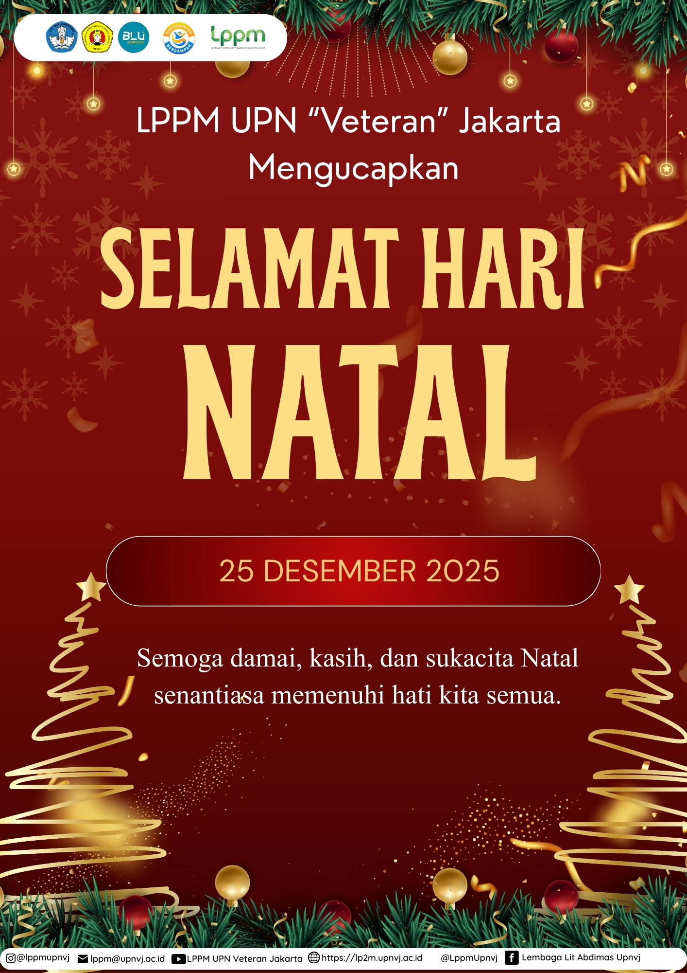LPPM UPN “Veteran” Jakarta mengucapkan Selamat Hari Natal 🌲🔔✨️. Semoga damai, kasih dan sukacita Natal senantiasa memenuhi hati kita semua ✨️