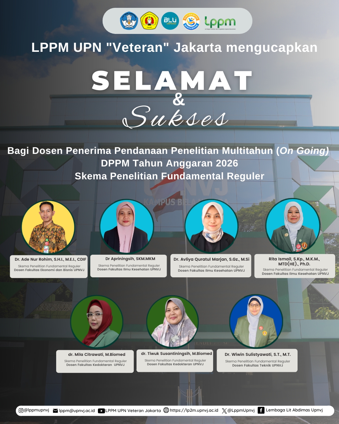 LPPM UPN “Veteran” Jakarta mengucapkan Selamat & Sukses bagi Bagi Bapak/Ibu Dosen UPN “Veteran” Jakarta penerima Pendanaan Penelitian Multitahun (On Going) DPPM Tahun Anggaran 2026 Skema Penelitian Fundamental Reguler. Semoga penelitian yang dijalankan dapat menghasilkan luaran yang bermanfaat dan berdampak luas.