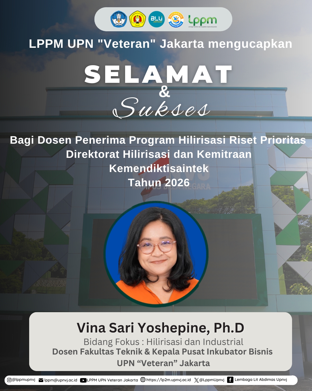LPPM UPN “Veteran” Jakarta mengucapkan Selamat & Sukses kepada Vina Sari Yosephine, Ph.D (Dosen FT & Kapus Inkubator Bisnis UPNVJ) sebagai Dosen Penerima Program Hilirisasi Riset Prioritas Direktorat Hilirisasi dan Kemitraan Kemendiktisaintek Tahun 2026 ✨2w