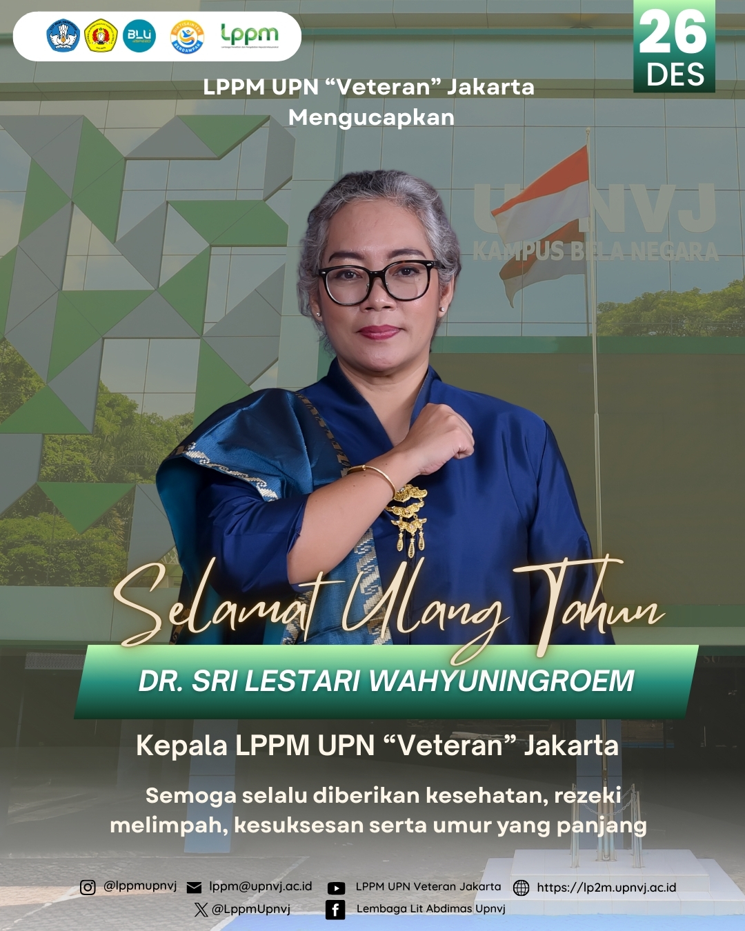 Selamat Ulang Tahun Ibu Kepala LPPM UPNVJ, Ibu @Dr. Sri Lestari Wahyuningroem . Semoga selalu diberikan kesehatan, rezeki yang melimpah, kesuksesan serta umur yang panjang. Aamiin ✨