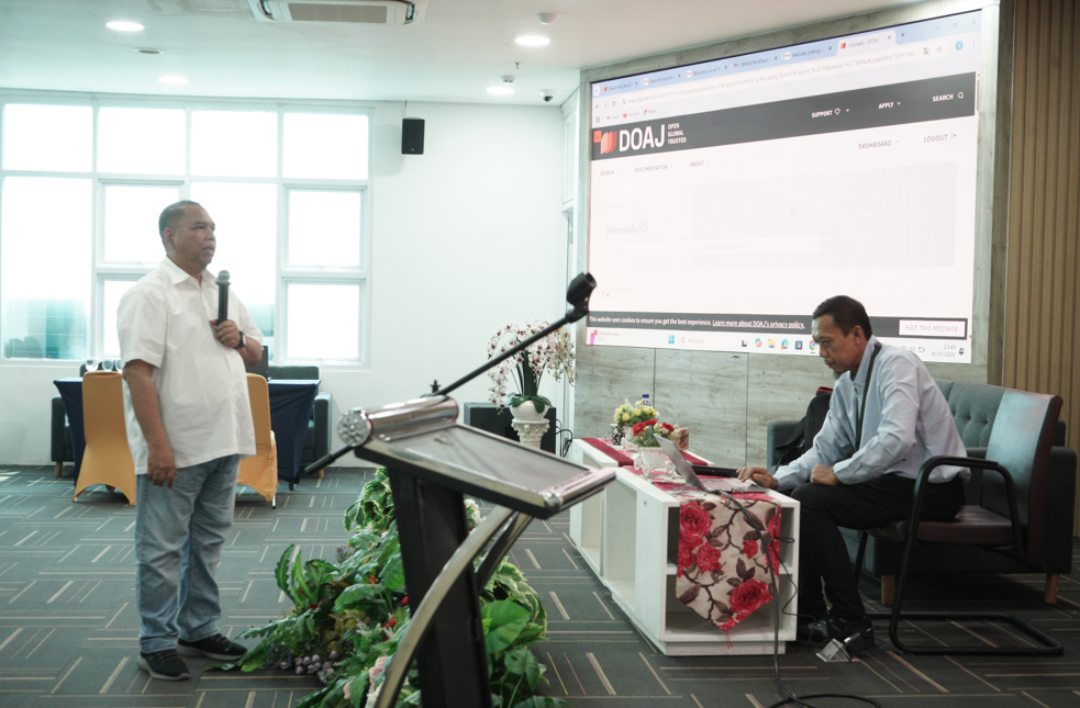 Acara kemudian memasuki sesi inti berupa simulasi pengisian formulir aplikasi DOAJ, evaluasi metadata, serta klinik editorial. Narasumber utama, Ikhwan Arief, M.Sc. (DOAJ Ambassador dan Managing Editor), memandu peserta secara langsung dalam simulasi pengajuan jurnal dengan memperhatikan elemen-elemen penting seperti struktur situs jurnal, kategori metadata, kebijakan editorial, serta aspek etika publikasi.